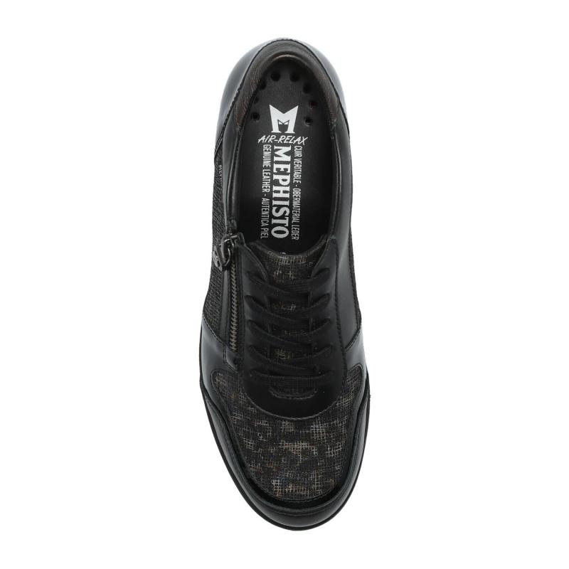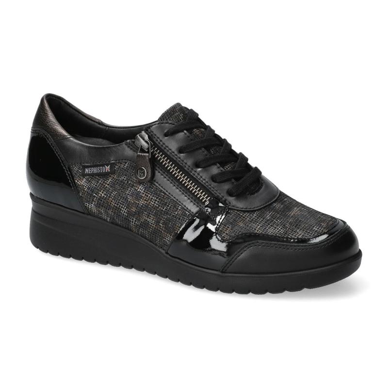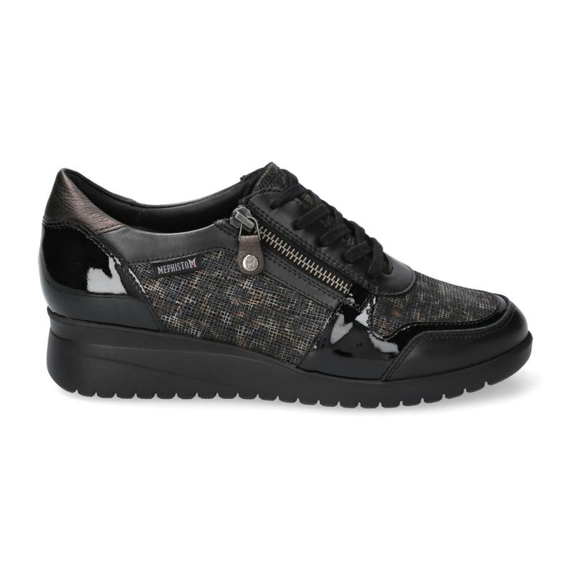 Sport chic compensé MEPHISTO Cuir noir imprimé fantaisie noir IASMINA Lacet + zip SOFT AIR