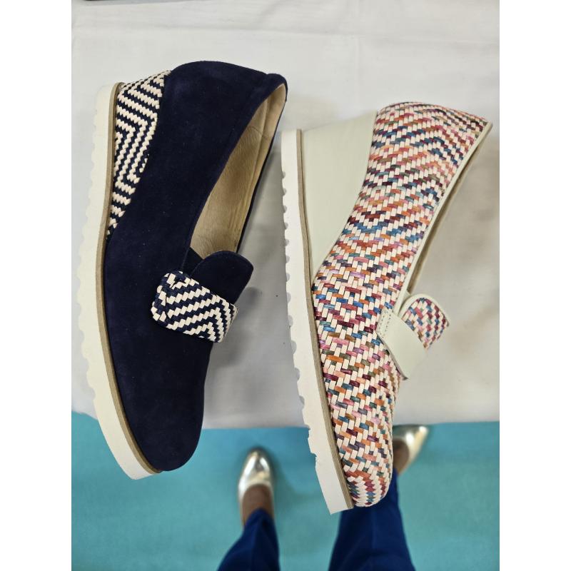 Softwaves propose des modèles du mocassin à la bottine. Ici un escarpin compensé élégant, coloré raphia multicolore et son cuir beige. Féminité assuré avec le modèle MIRA.