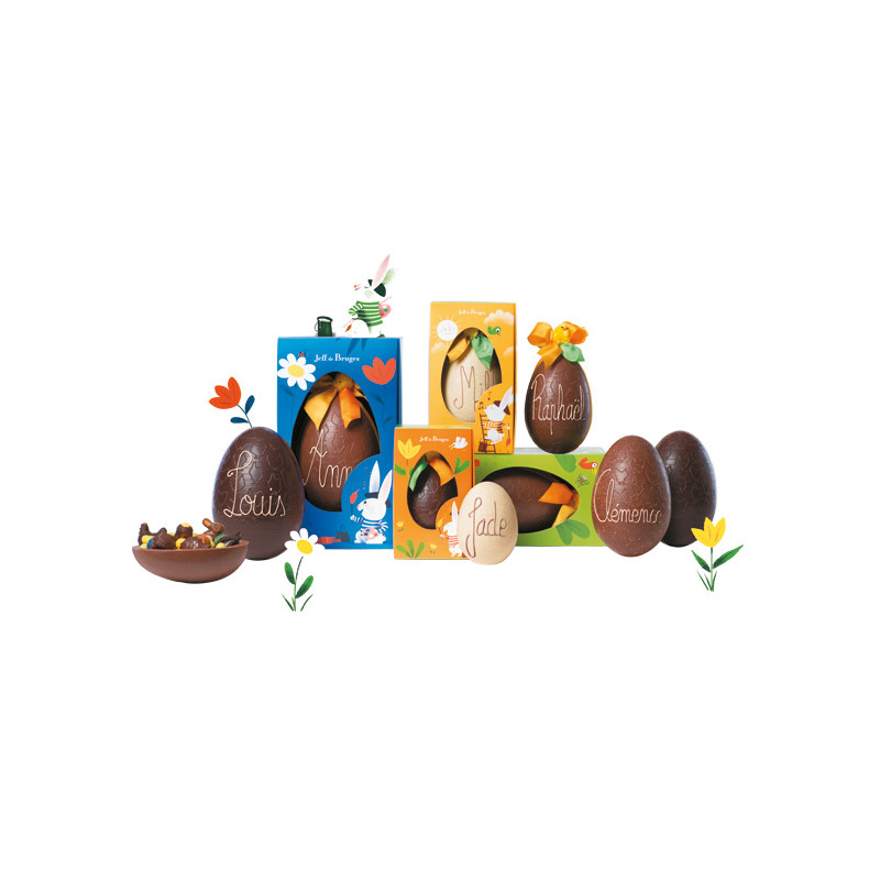 L’œuf 13 cm en chocolat au lait. Voilà une savoureuse idée ! Faire inscrire gratuitement le prénom de son choix sur un œuf en chocolat. En plus, il est garni d’un savoureux assortiment de chocolats de Pâques ! Mentionner dans les commentaires le prenom à inscrire.