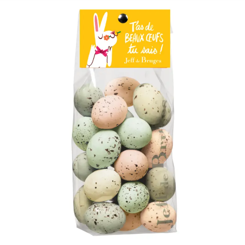 Pour Pâques, quoi de mieux que les oeufs coquille au praliné ? Ceux-ci sont très spéciaux et cachent bien leurs j’« oeufs ». Sous leur fine couche de sucre coloré en jaune, bleu, vert ou en rose se cache un praliné tendre ou un praliné croustillant aux éclats de crêpe dentelle. Saurez-vous devinez lesquels ?