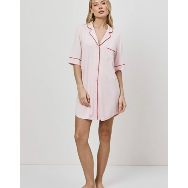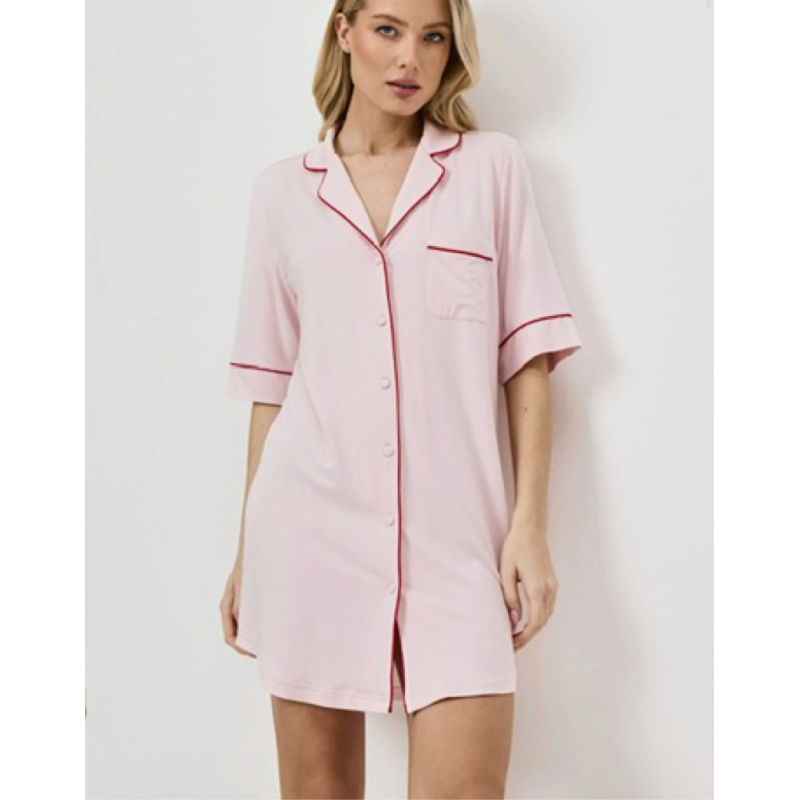 La nuisette présente un col cranté, une fermeture boutonnée sur le devant, des manches courtes et une poche poitrine.