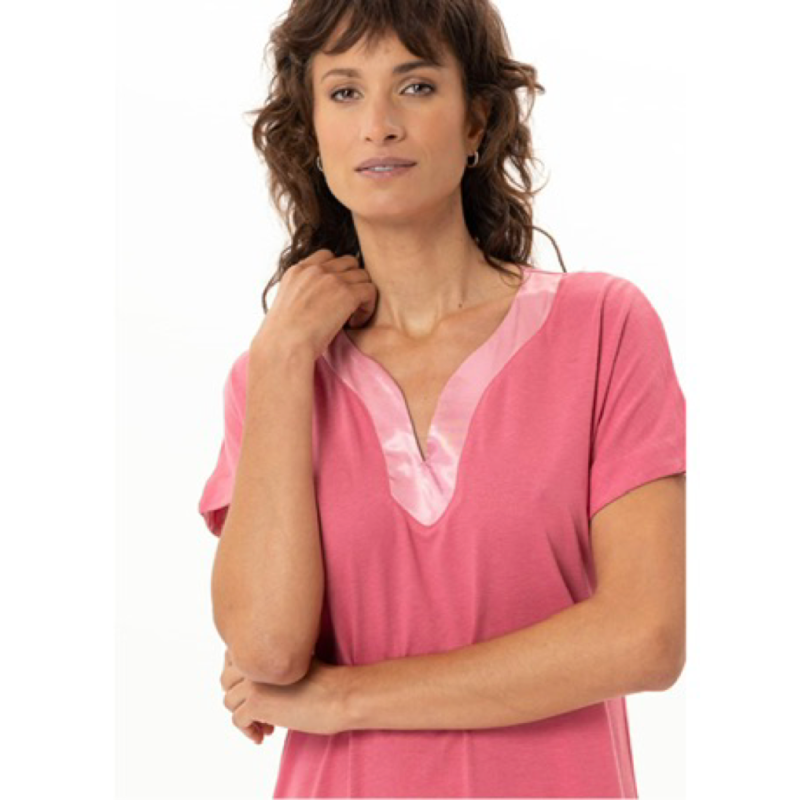 - Encolure V légèrement arrondie, soulignée par un large empiècement en satin assorti, doublé de coton-modal